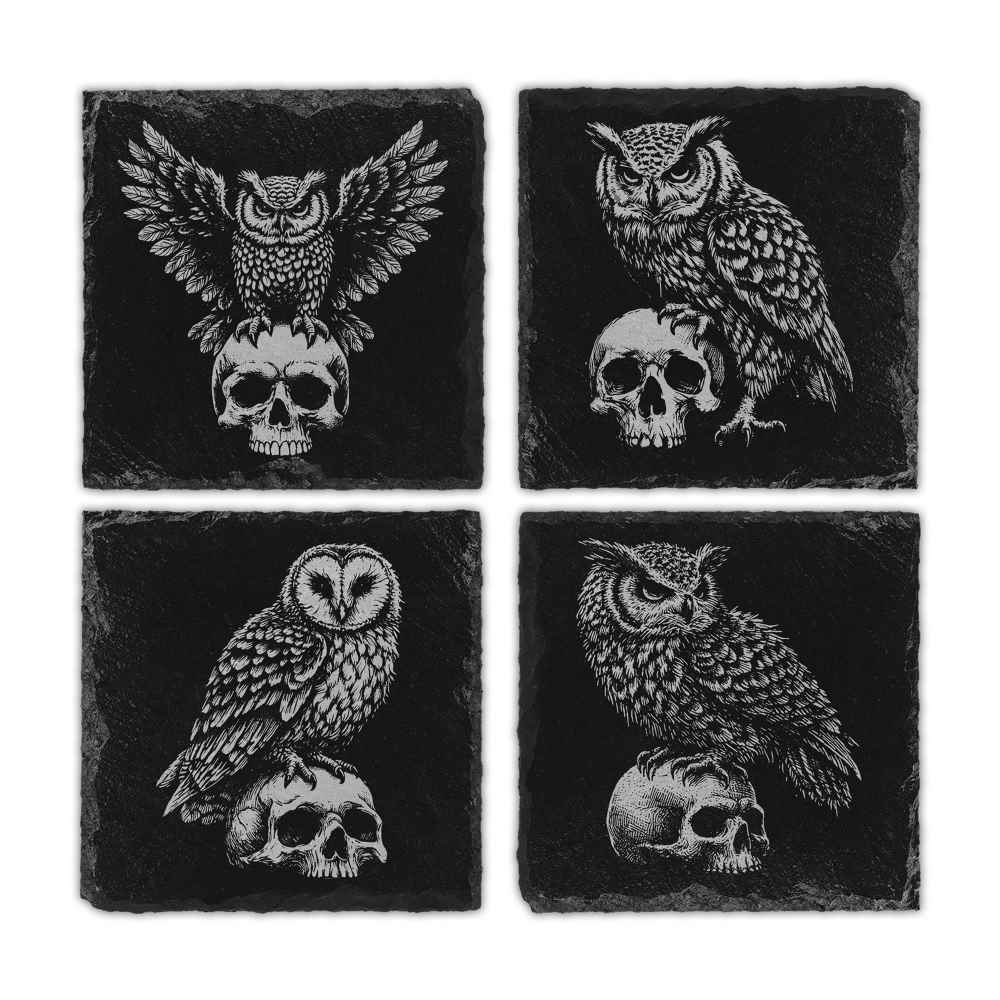 This is a set of dark owls with a skull, engraved in-house on natural slate coasters. Perfect to protect your surfaces while enjoying a witchy or goth cppa.